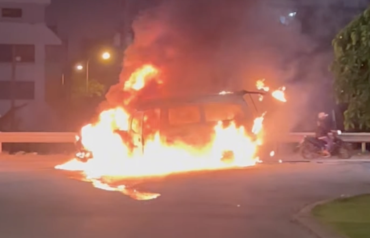 Ôtô 9 chỗ cháy ngùn ngụt trước khu dân cư. Video: Minh Bằng