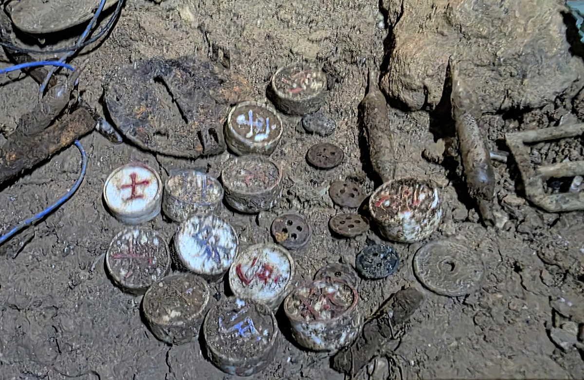 Bộ cờ tướng và nhiều di vật được tìm thấy cùng hài cốt. Ảnh: Đoàn Kinh tế – Quốc phòng 337