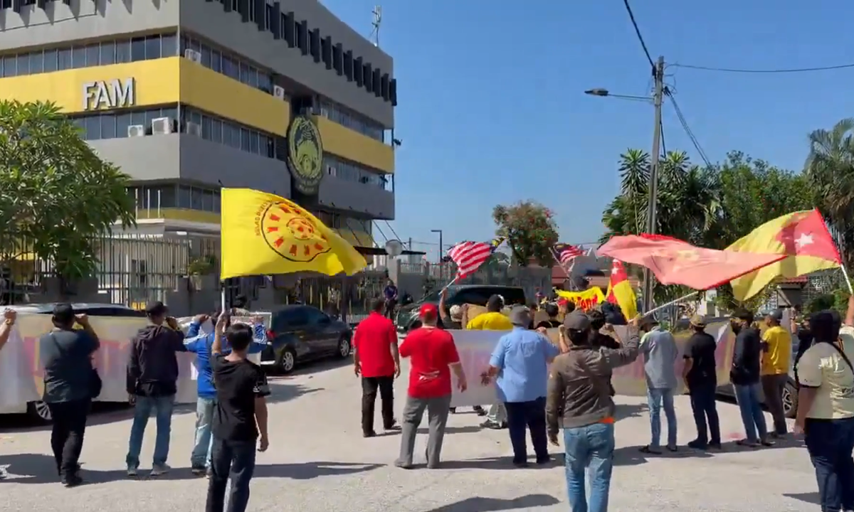Người hâm mộ Malaysia biểu tình ôn hòa trước trụ sở LĐBĐ Malaysia ở Kuala Lumpur, vào sáng 17/3/2026. Video: X/@Fina_Nasrom