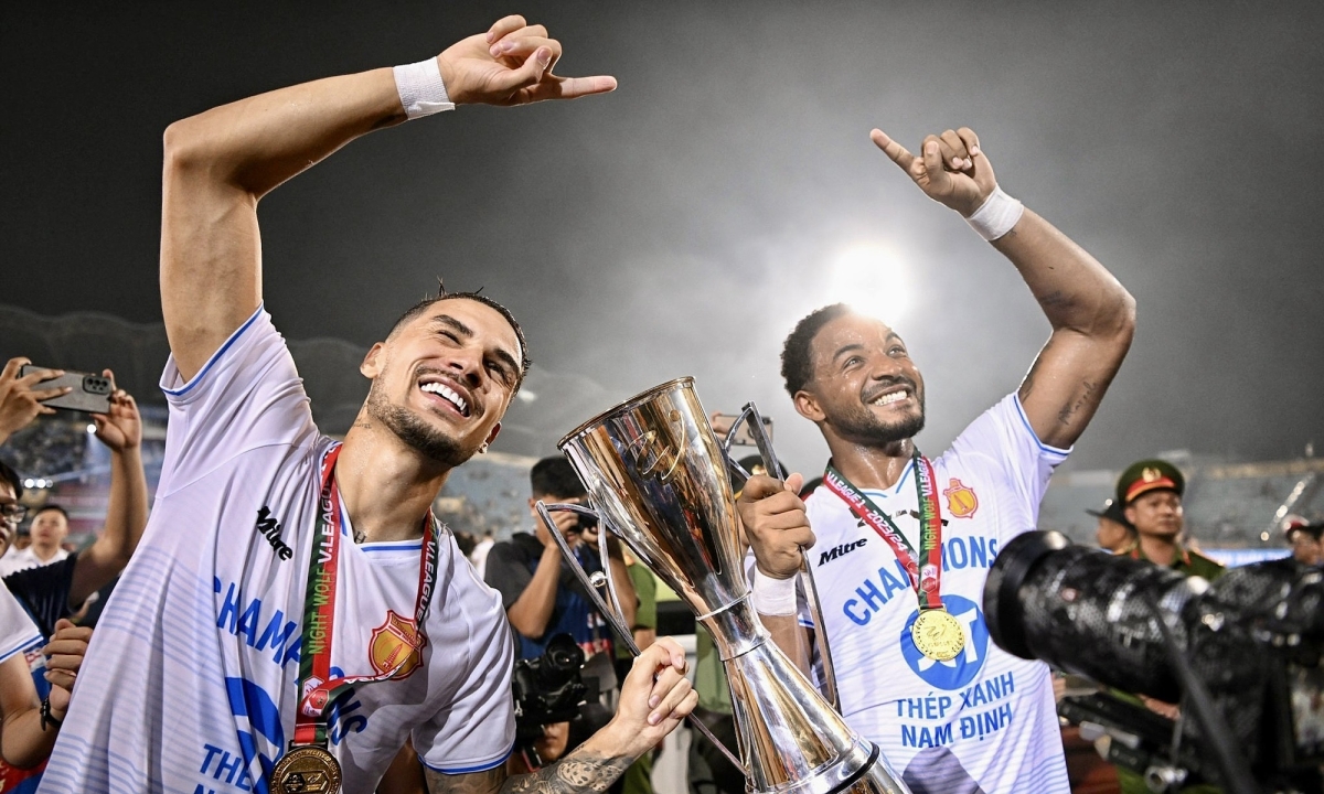 Bộ đôi Rafaelson (Nguyễn Xuân Son - phải) và Hendrio (Đỗ Hoàng Hên - trái) nâng cup V-League 2023-2024 tại sân Thiên Trường vào ngày 25/6/2024. Ảnh:Giang Huy